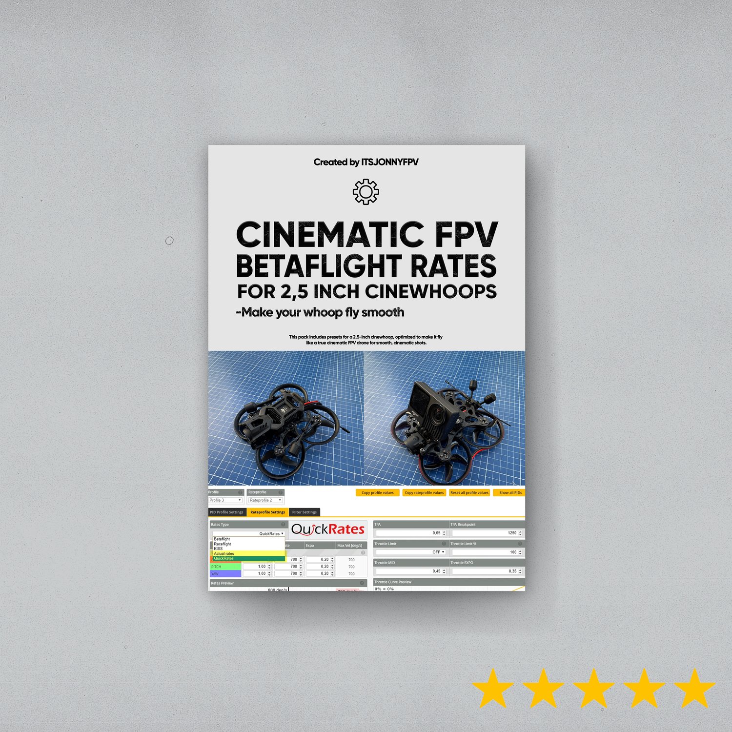 - 1x favorite cinematic Betaflight Rates for 2,5 inch Cinewhoops or smaller.